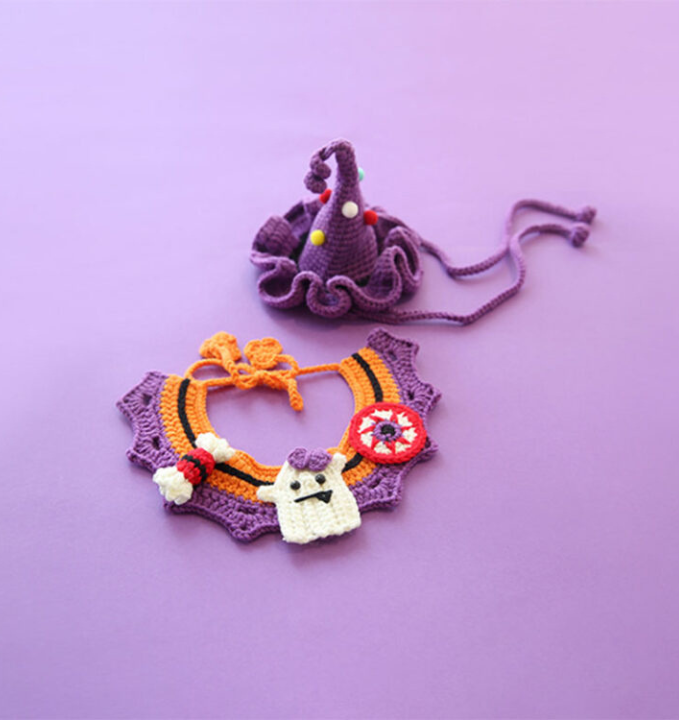 Pumpkin Patch Orange: This vibrant set features a classic witch hat and a matching collar, both adorned with a cheerful jack-o'-lantern.