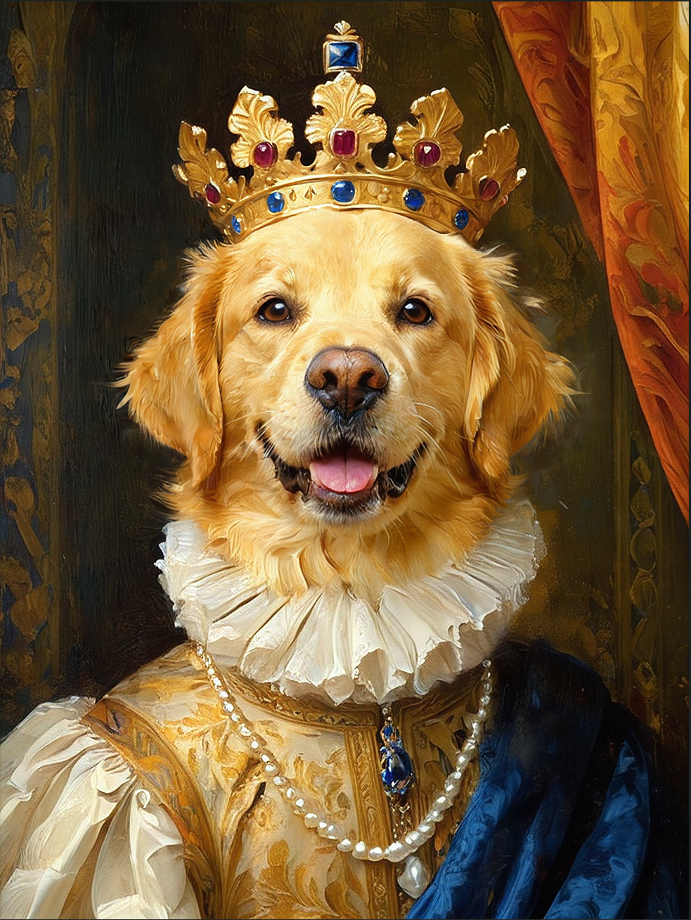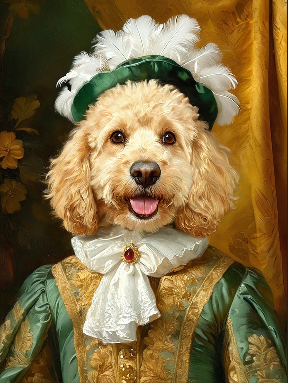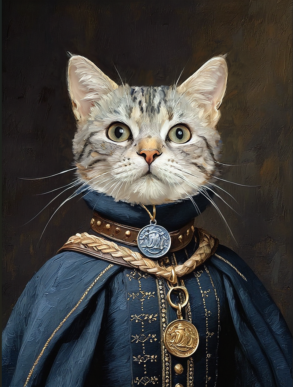 Imagine your furry, scaly, or feathered friend gazing down from your wall, transformed into a magnificent, hand-painted noble from a bygone era. Our custom pet oil portraits blend your pet's adorable personality with the timeless grandeur of classic art, creating an heirloom piece you'll treasure forever.