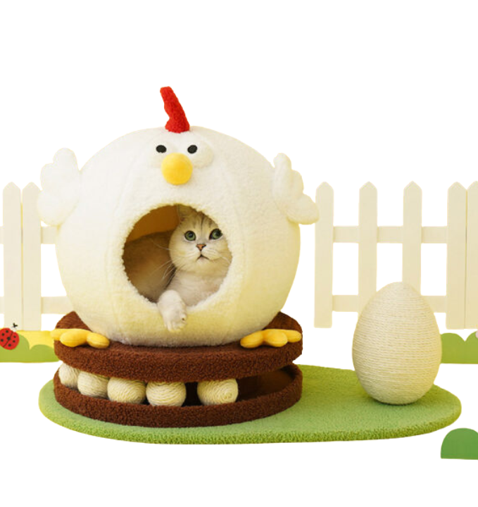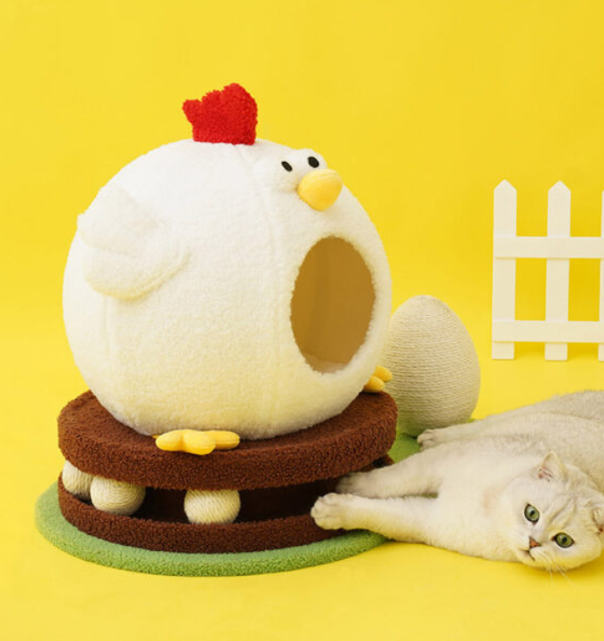 • 🐔 Hilarious Hen House: The centrepiece is a spacious and cozy cat condo shaped like a friendly hen. Its enclosed design provides a secure, private den for your cat to feel safe and snuggle up for a deep sleep.